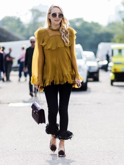 La bloguera Leonie Sophie Hanne lleva una blusa con volantes en color mostaza, combinada con pantalones con volantes negros y accesorios también en negro.
