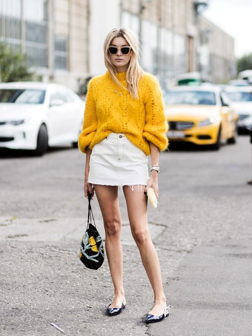 La bloguera Camille Charriere lleva el look perfecto para este momento. "No quieres dejar de llevar las minis de verano pero hace algo de fresco y te apetece ponerte un jersey peludito ¡Este es tu look!