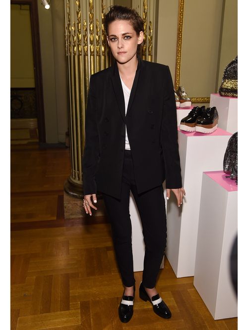 Para los looks masculinos, los mocasines son el acompañante perfecto. Kristen Stewart, da en el clavo con su outfit: traje de chaqueta sencillo, combinado con unos mocasines de charol con un poco de tacón y detalle en blanco.
