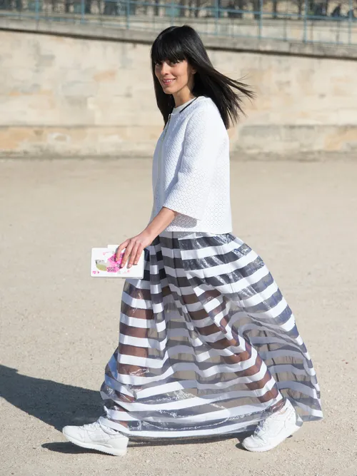 La falda maxi adquiere un aire casual gracias a unas sneakers planas y sencillas (cuanto más mejor). Puede que esta sea una forma de volver a ponerte la falda que compraste "solo" para llevarla a boda de tu prima.