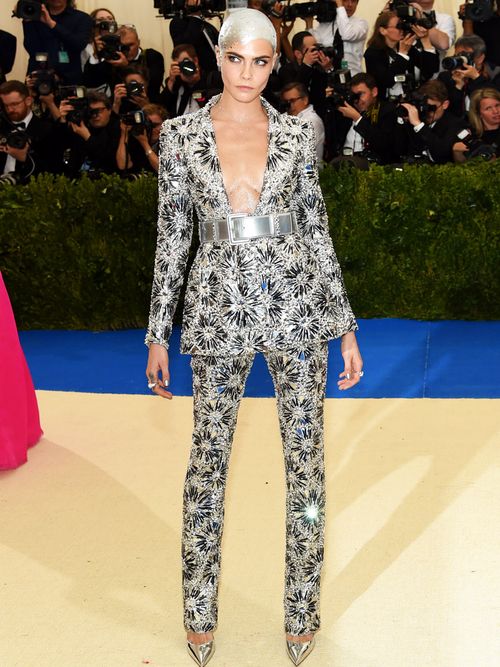 La actriz y modelo Cara Delevingne lució pelo rapado y traje plata de Chanel. #CaraForever. La modelo sorprendió, para bien, con este conjunto de chaqueta y pantalón de Chanel, por ser espectacular y por cómo le sienta. Por si fuera poco, se atrevió a combinar el pelo con los colores plateados. ¡Una pasada!