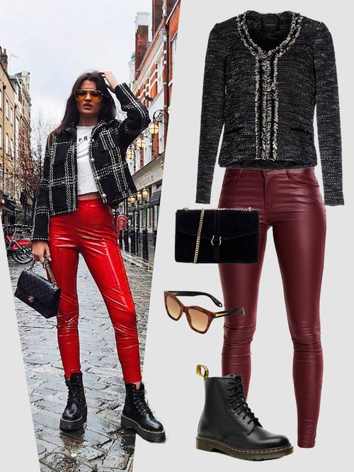 Marta Lozano lleva un estilo muy acertado para un día de lluvia en Londres. Las DrMartens son un guiño al estilo british y las combina con pantalones pitillo encerados rojo pasión de TopShop -si no te atreves con ese color, te proponemos un burdeos- camiseta básica y una chqueta de tweet a la que resta formalidad con el resto de las prendas.