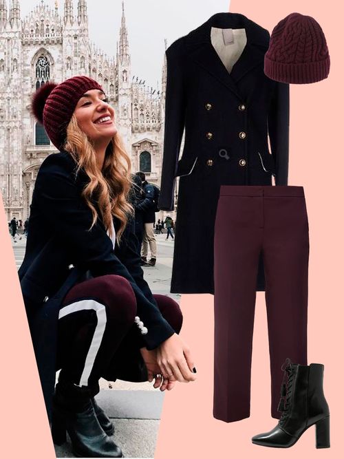 La bloggera, nos regala esta instantánea con un look athleisure, en la que lleva un pantalón burdeos con raya blanca lateral, abrigo de corte militar azul marino, gorrito con pompón.