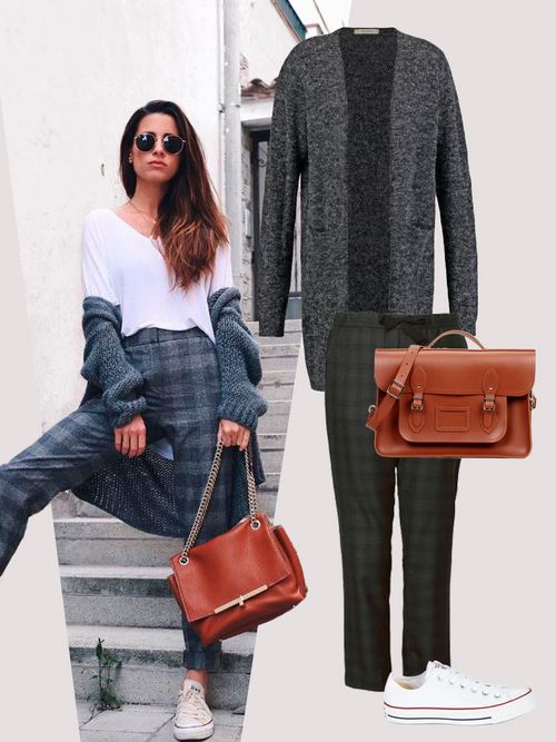 María Valdés lleva un look ideal para un viernes, un look cómodo y apto para el trabajo. Pantalón de traje a la altura del tobillo en tartán gris, chaqueta de punto y camiseta básica blanca. El bolso en marrón es todo un acierto para contrastar con los tonos grises. Converse y gafas Ray-Ban.