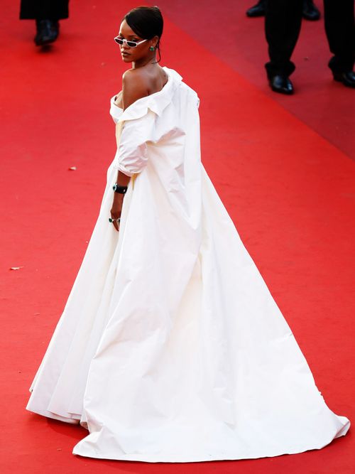Rihanna sorprendió con un vestido futurista de Andy Wolf y detalle de gafas de sol blancas.