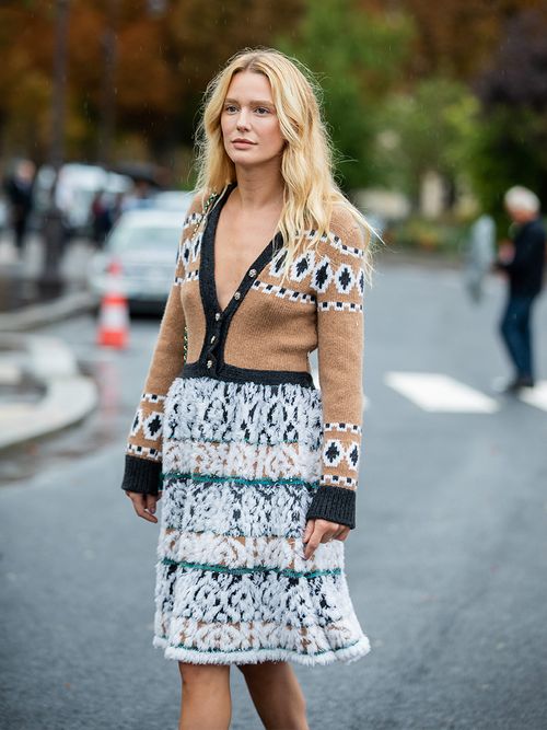 No lo dudes: adopta el estilo de abuela renunciando a la camiseta y combinando el cárdigan con una falda con textura.