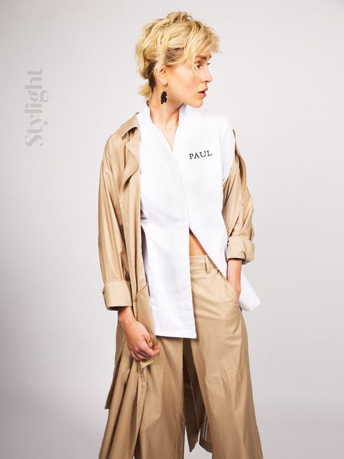 La prenda más refinada del uniforme de Paul Bakery requiere de un outfit premium. Hemos combinado la camisa abotonada con pantalones crapi de pata ancha y chaqueta en tonos marrones. Un croissant s’il vous plait!