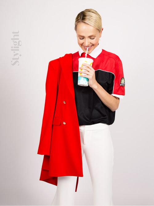 ¿Quién no recuerda la colección de Jeremy Scott para Moschino inspirada en McDonald’s del pasado otoño 2014? Siguiendo la misma línea, hemos combinado el uniforme del restaurante de comida rápida con una americana en rojo “ketchup”, pantalones blancos y cómodas Adidas – “we’re loving it!”