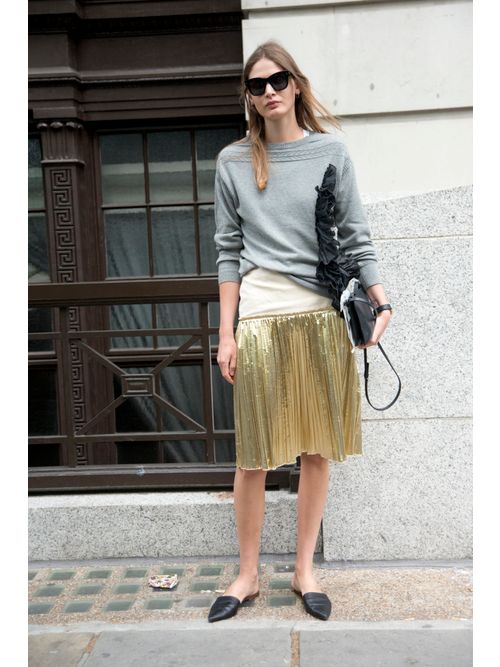 Si una prenda efecto oro es demasiado, opta por alguno de los accesorios de moda , preferiblemente en los pies. O recurre a los clásicos: joyas de oro -nada como algo heredado para darle todavía más importancia-. Natalie Cantell es experta en hacer de un look, un lookazo, con solo añadir pequeños touch of gold.