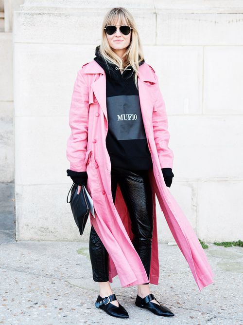 ¿Cómo se puede ir a la moda con sudadera y pantalón de chándal? Solo tienes que decidirte por un pantalón de chándal de efecto piel o con detalles en cuero, al estilo de la editora de moda Jeanette Madsen. Puedes combinar tu look con unas modernas bailarinas de hebilla junto con un abrigo largo de corte clásico y, ¡listo!