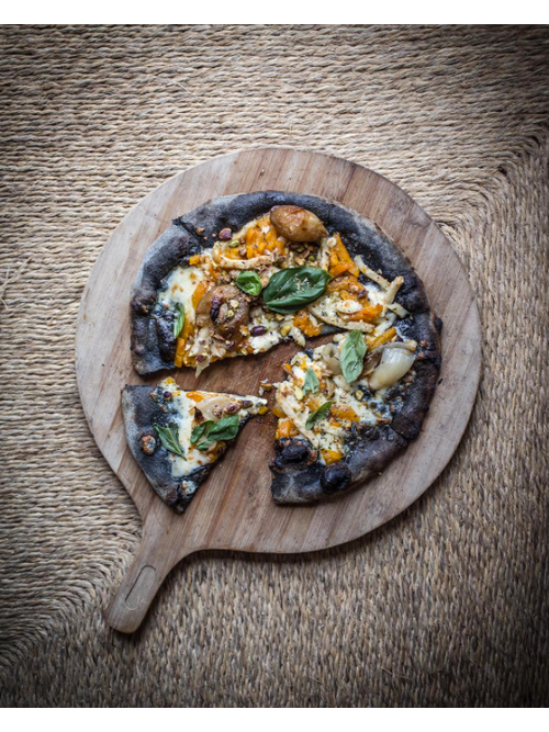 "Una pizza veggie para veggies y no veggies" es de pan de carbón, calabaza, cebolla caramelizada, queso y pistachos. Deliciosa y fácil ¿no?