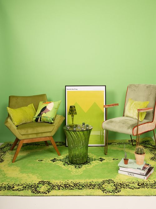 Alfombra y sillones de Kare, Mesa y Lámpara de Kartell, Cactus de Urban Outfitters, Cuadro y Cojines con tucán de Juniqe, Cojín en verde claro de Zara Home.